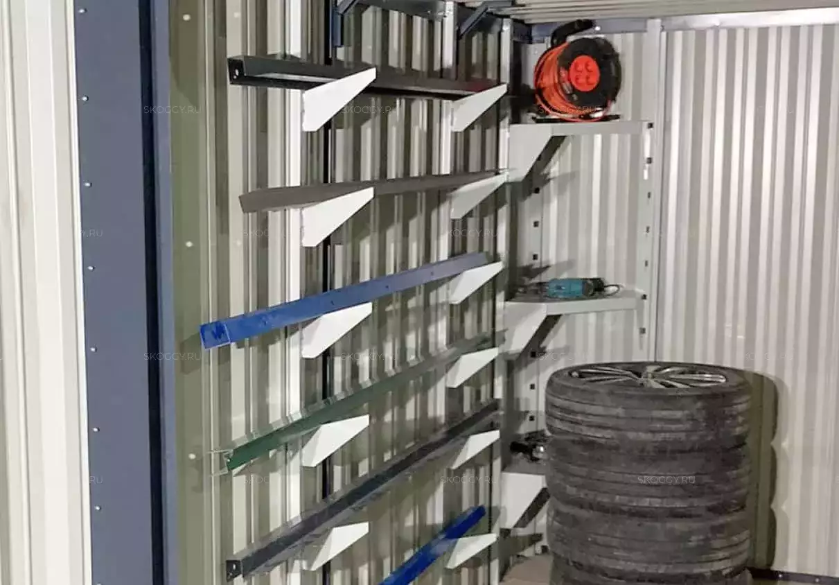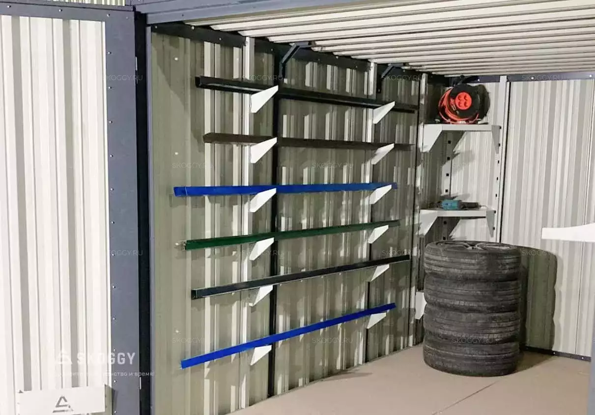 Система хранения инвентаря на направляющих SKOGGY позволяет компактно расположить хозяйственный инвентарь на стене. Обычно ее устанавливают в контейнерах, которые планируется использовать в качестве хозблока на дачном или приусадебном участке.
