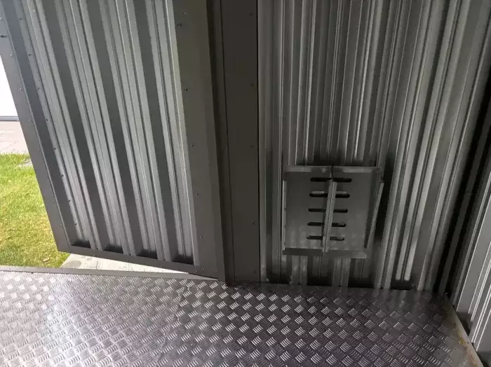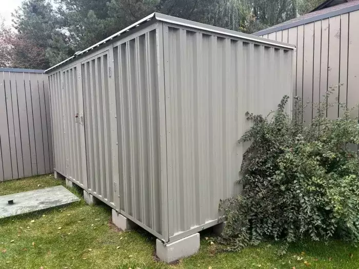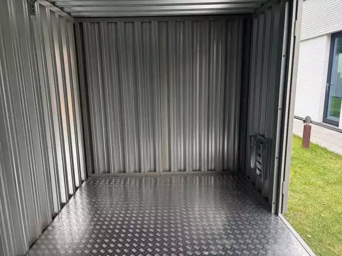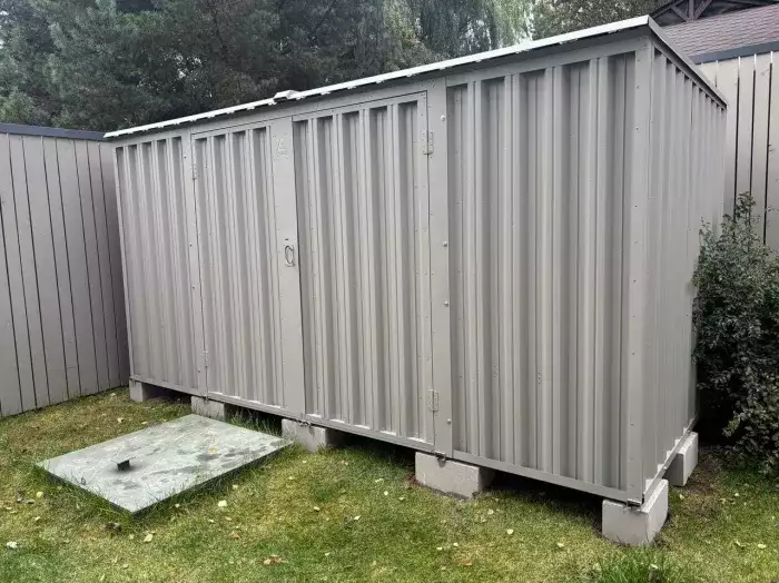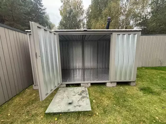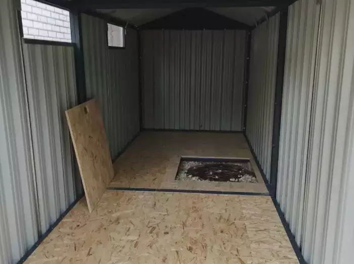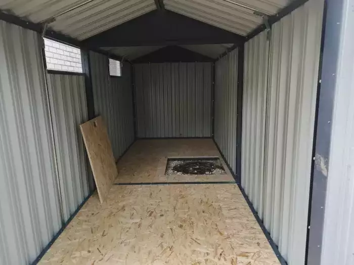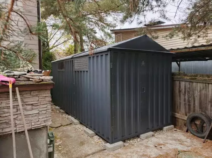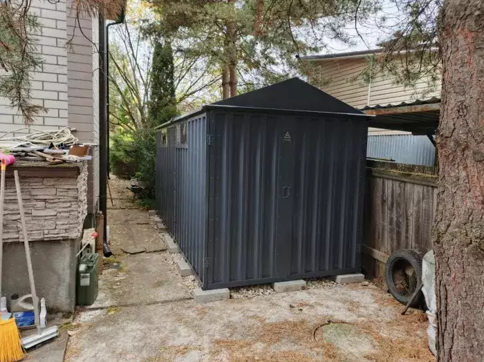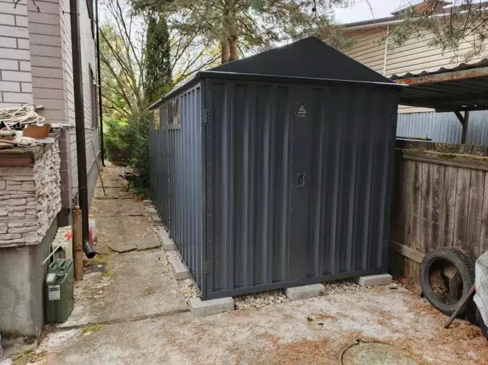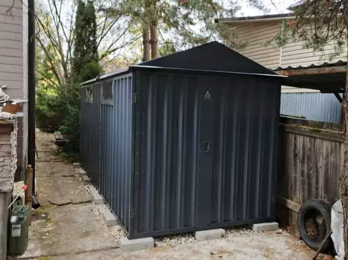 Для Николая мы изготовили 3-метровый хозблок с двускатной крышей и торцевой дверью. Окрас будущая постройка получила в стильный брутальный цвет RAL 7024. Мы доставили конструкцию и осуществили установку на бетонные блоки.
