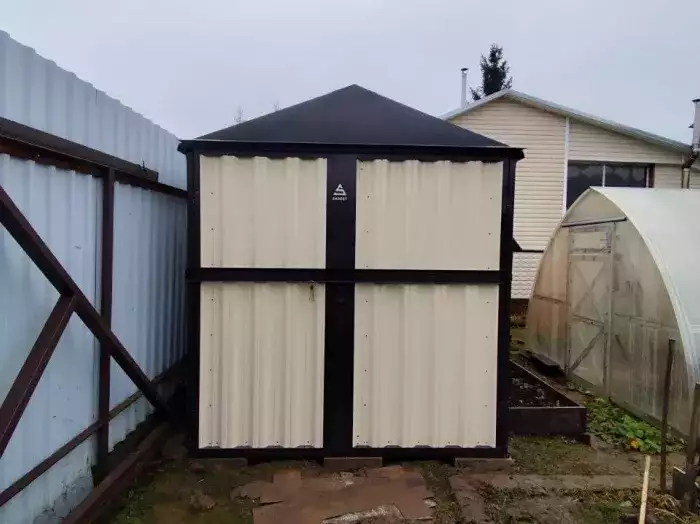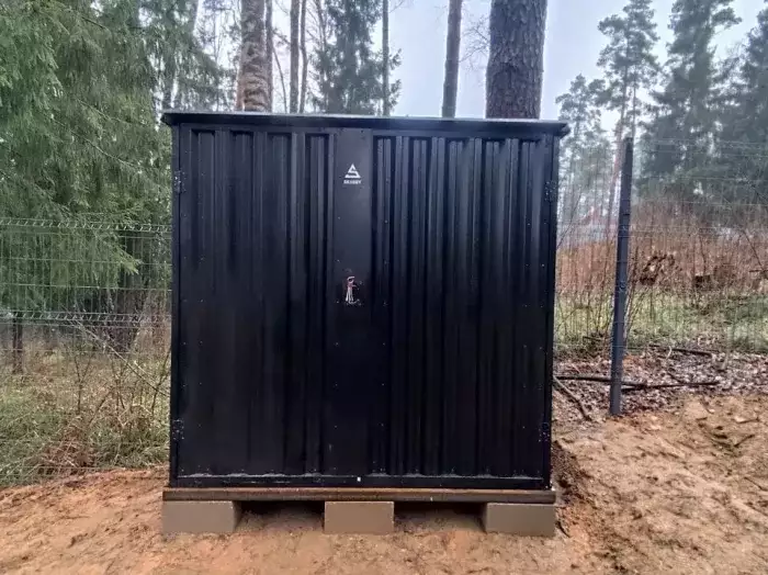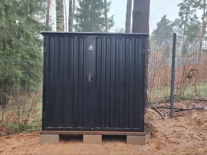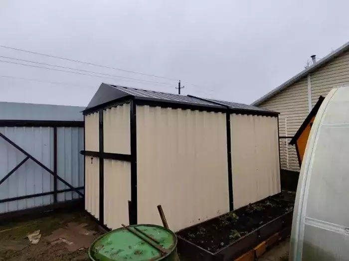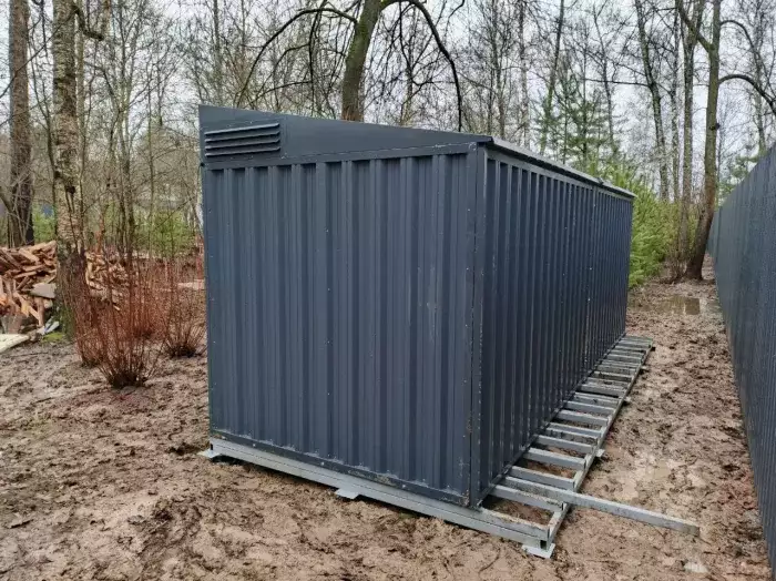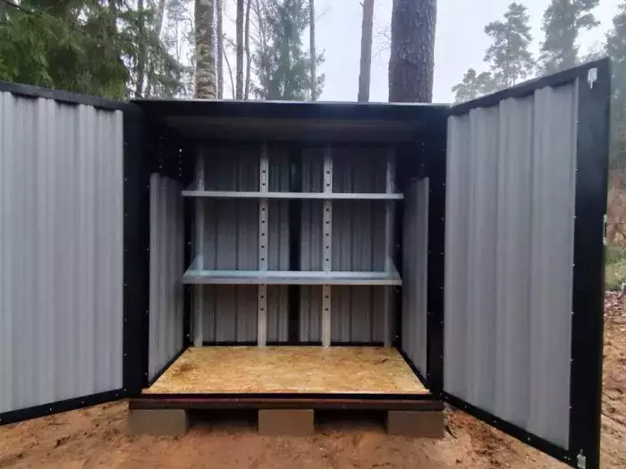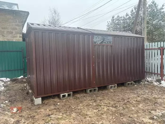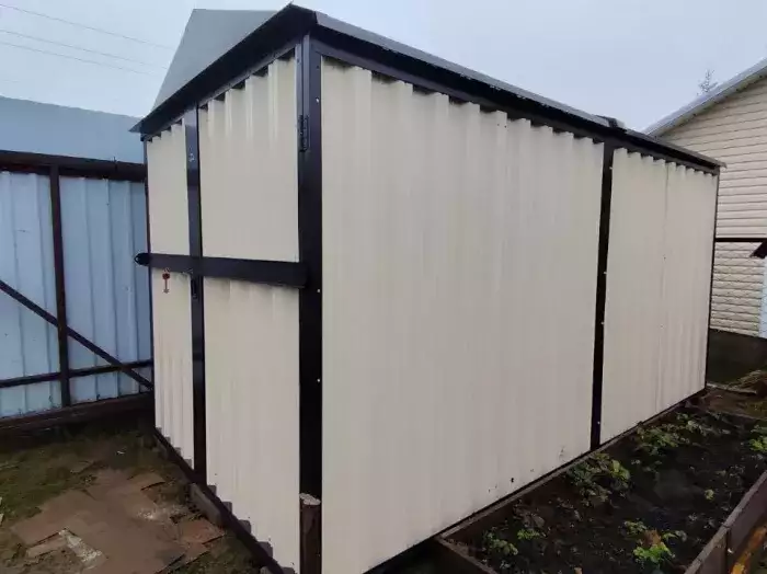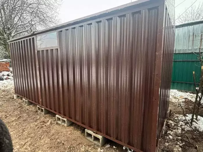 Нами была изготовлена 4-метровая конструкция с односкатной крышей и торцевой воротной группой в блестящем цинковом цвете. Дополнительно хозблок оборудовали антивандальным засовом. Теперь у злоумышленников нет шансов:)
