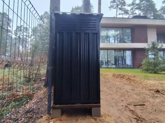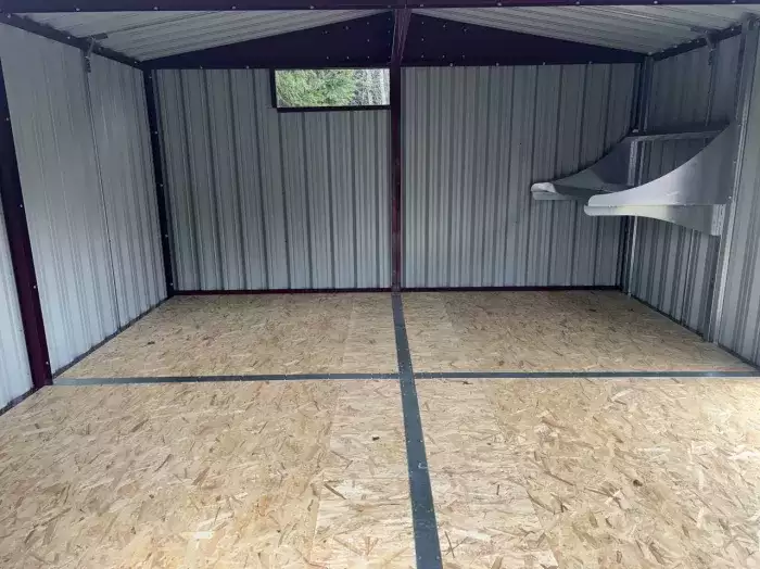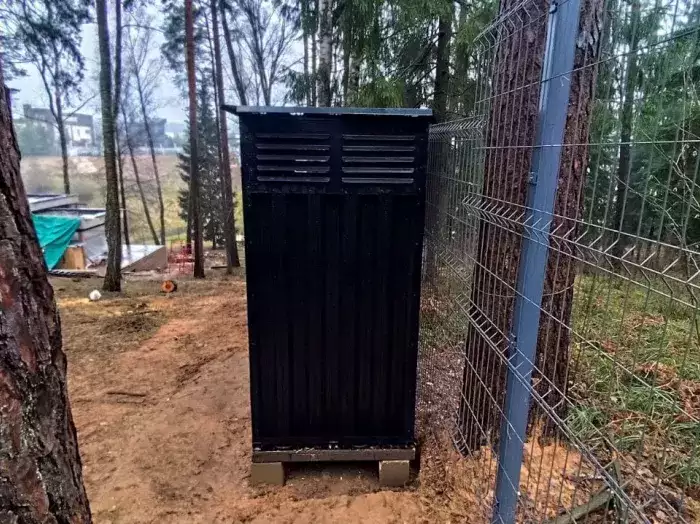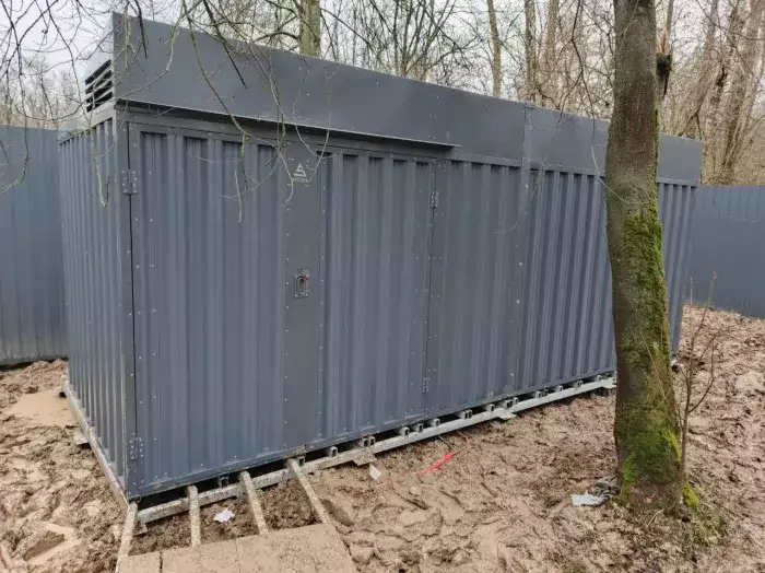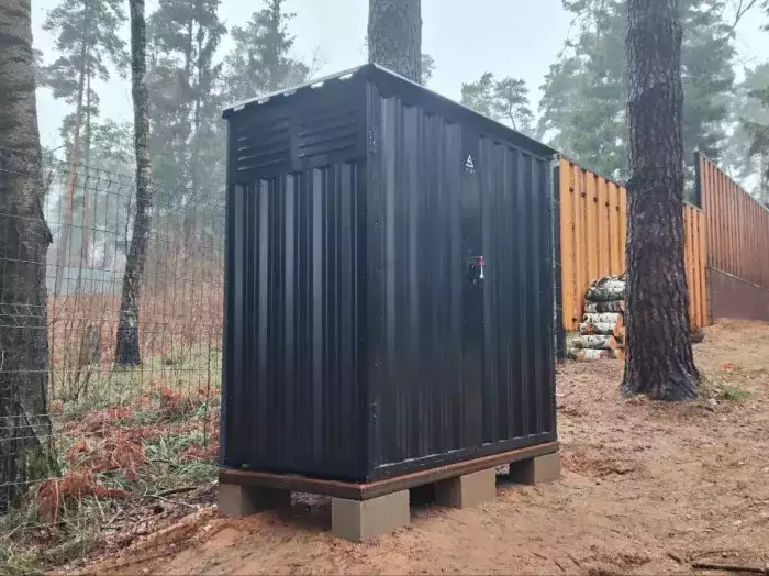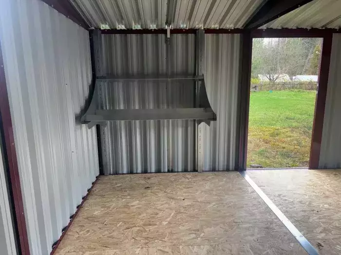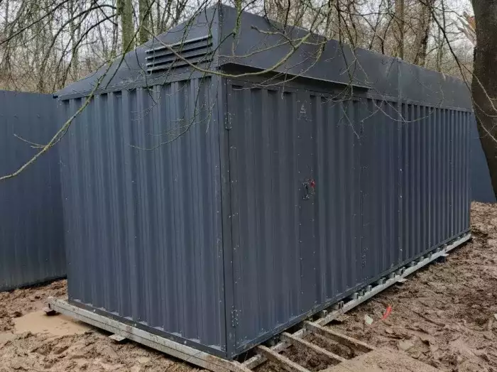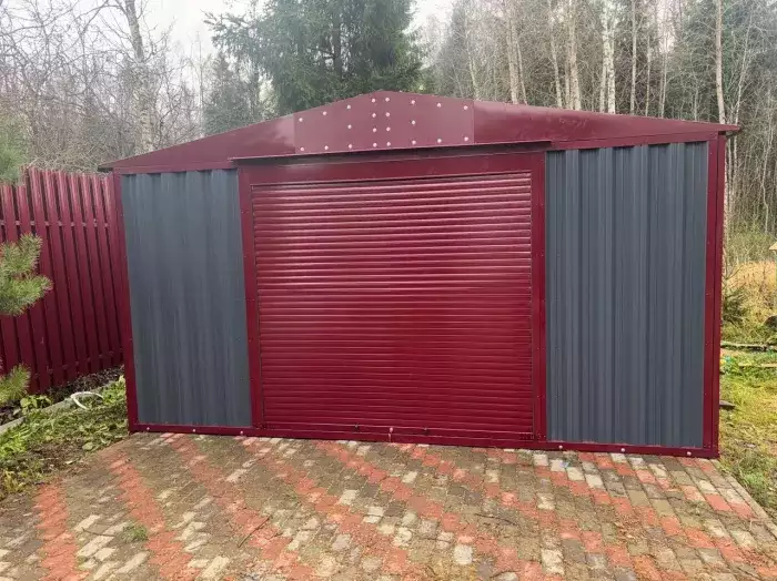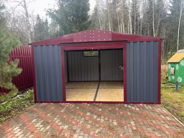 Нами была изготовлена 4-метровая конструкция с односкатной крышей и торцевой воротной группой в блестящем цинковом цвете. Дополнительно хозблок оборудовали антивандальным засовом. Теперь у злоумышленников нет шансов:)