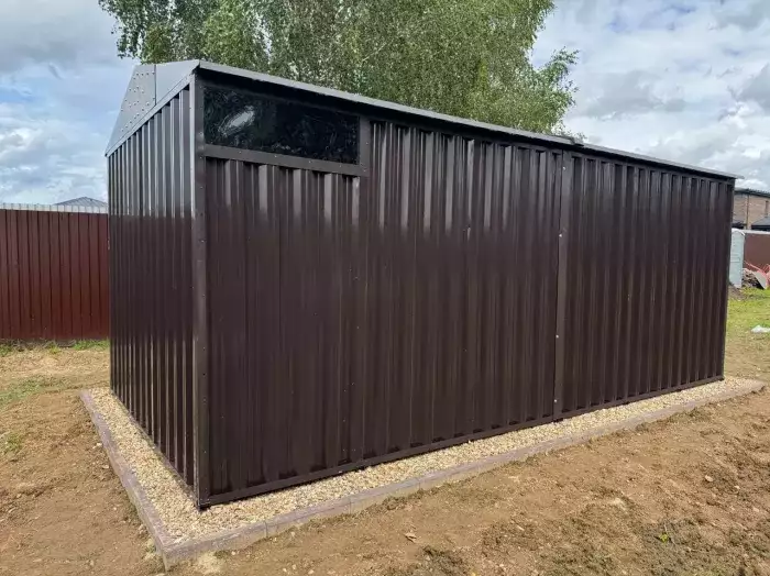 Нами была изготовлена стандартная 6-метровая конструкция с односкатной крышей и торцевой воротной группой в стильной расцветке «под дерево» Темный дуб. Дополнительно, по желанию заказчика, по боковой стороне была установлена дополнительная входная дверь шириной 1 м.