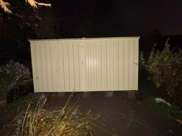 Нами была изготовлена нестандартная конструкция размером 2,4 х 2,16 х 2,45 м с односкатной крышей и торцевой входной группой с рольставнями в нежном цвете RAL 1014 «слоновая кость». Выбор в пользу этой расцветки был сделан для того, чтобы хозблок гармонировал по цвету с жилым домом на участке.