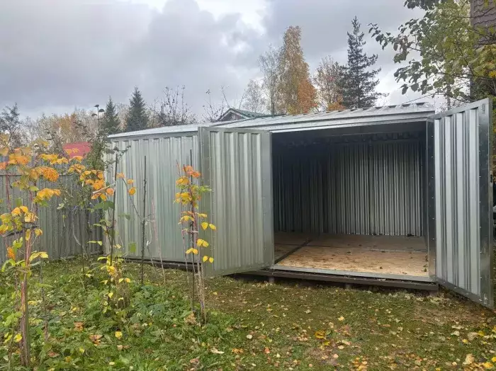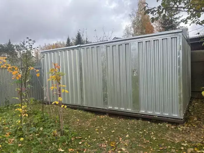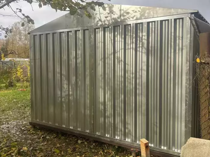 Заказчику этого проекта на участок был необходим хозблок для хранения садового инвентаря и мототехники. Изначально он рассматривал изделие в стандартном цинковом цвете, но в итоге принял решение в пользу окрашенной постройки.