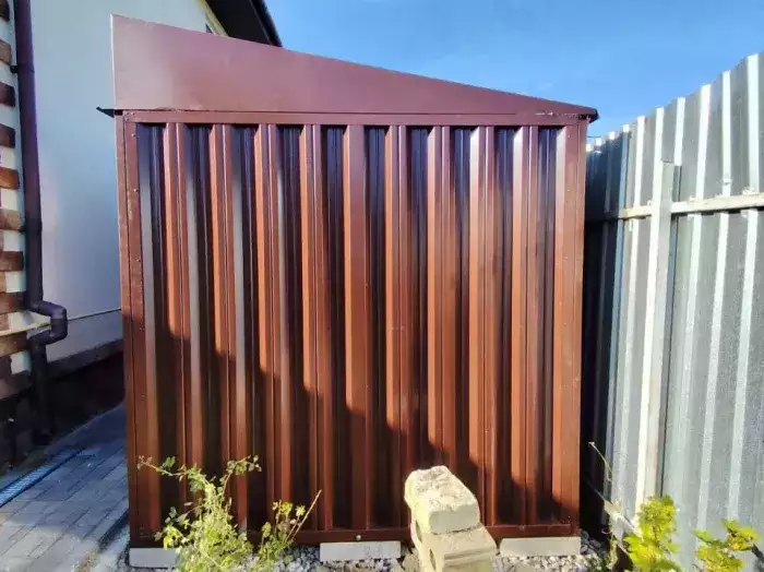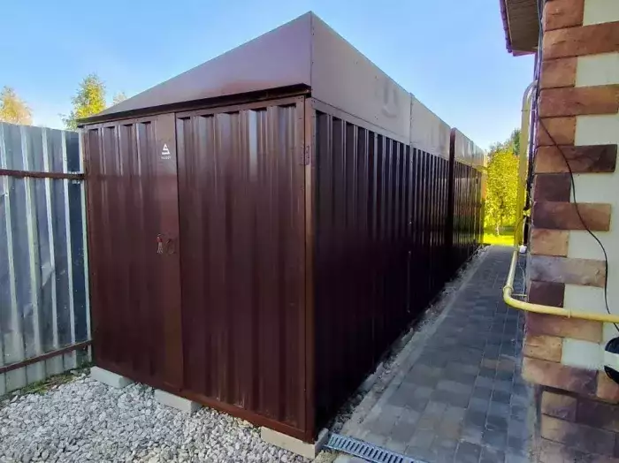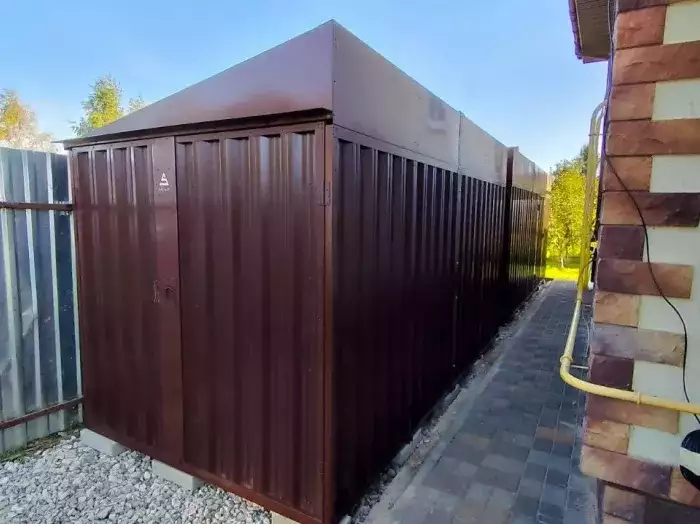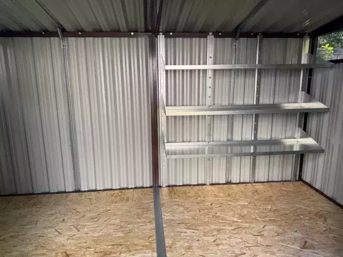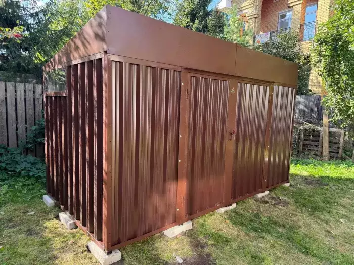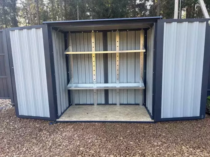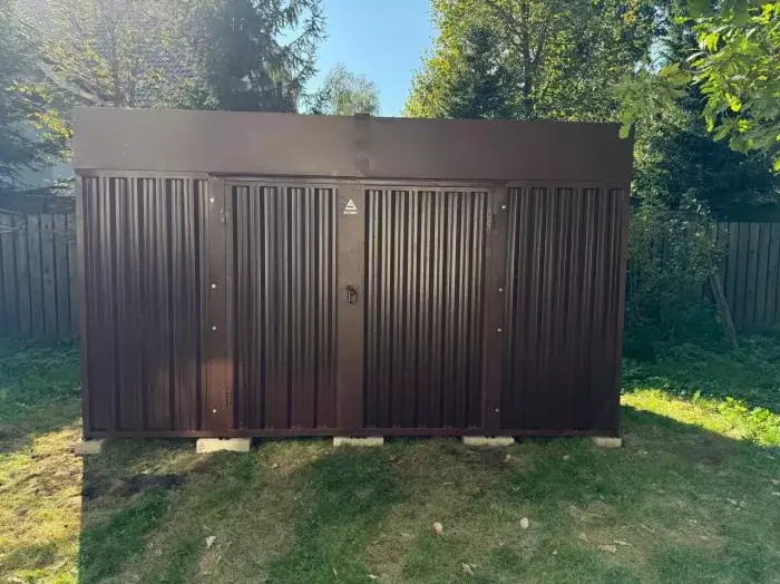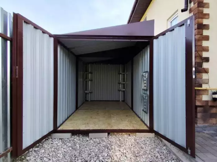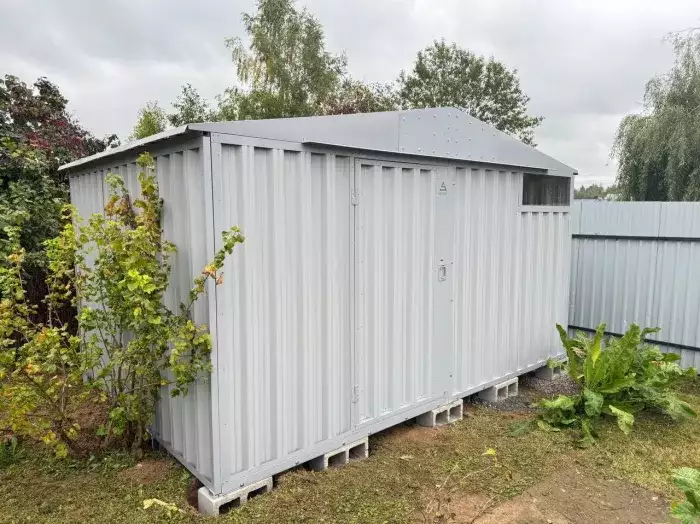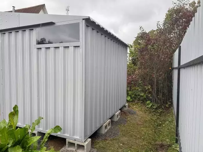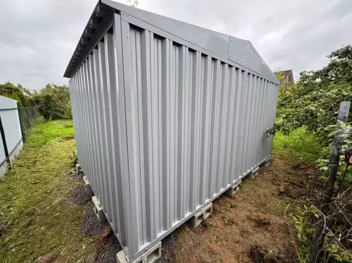Нами была изготовлена 5-метровая конструкция с односкатной крышей и торцевой воротной группой в блестящем цинковом цвете. Для удобства входа хозблок оборудовали дополнительной дверью сбоку. Эту конструкцию мы выполнили с увеличенной толщиной профлиста 0,7 мм.