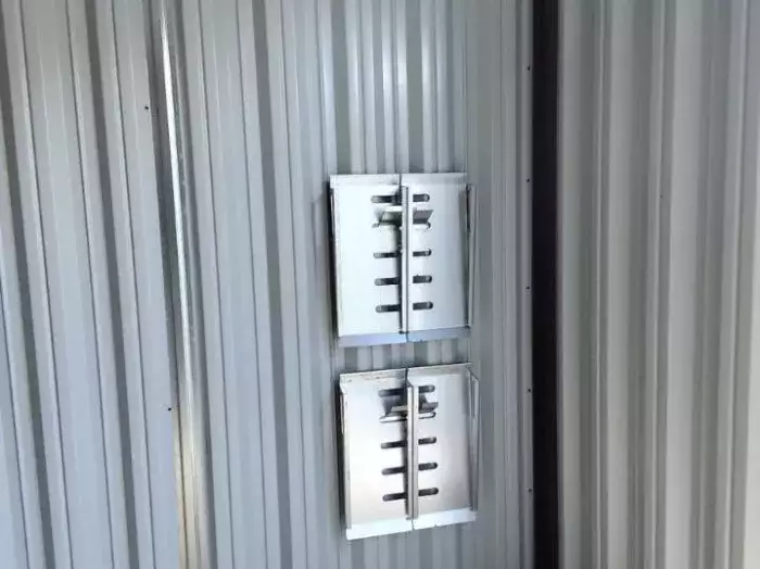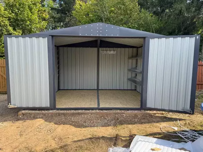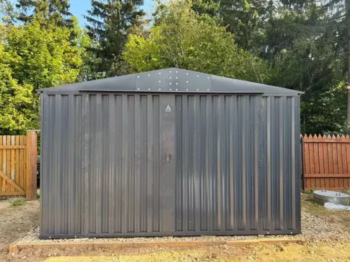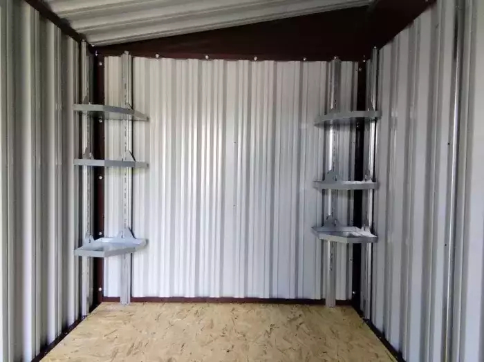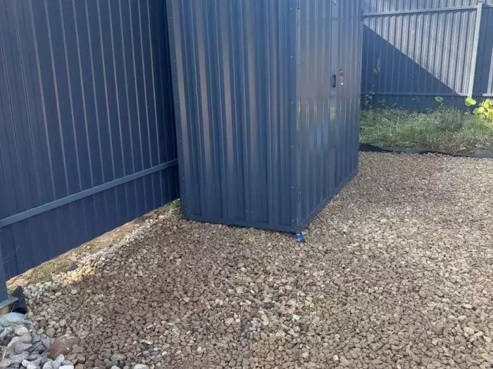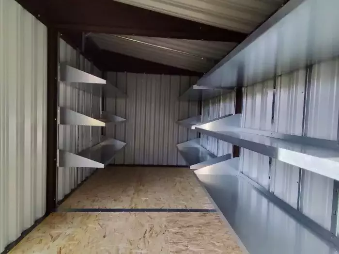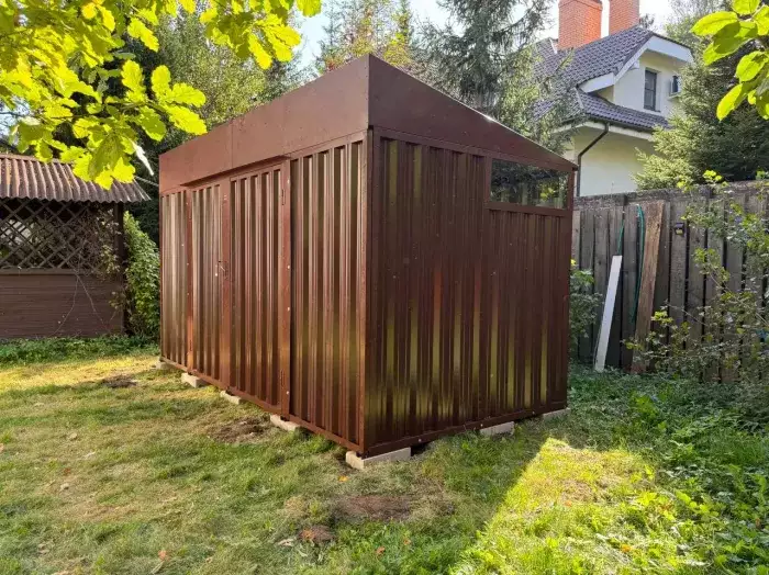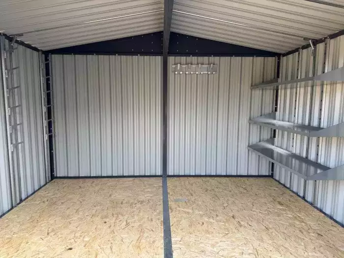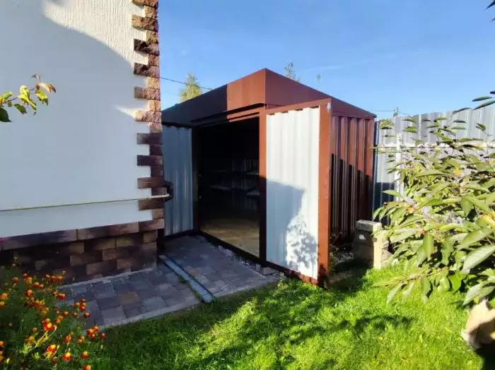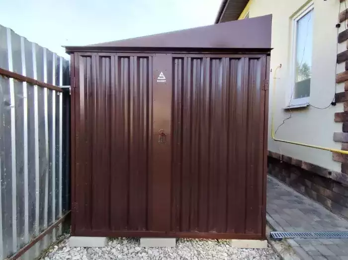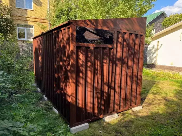 Нами была изготовлена 5-метровая конструкция с односкатной крышей и торцевой воротной группой в блестящем цинковом цвете. Для удобства входа хозблок оборудовали дополнительной дверью сбоку. Эту конструкцию мы выполнили с увеличенной толщиной профлиста 0,7 мм.