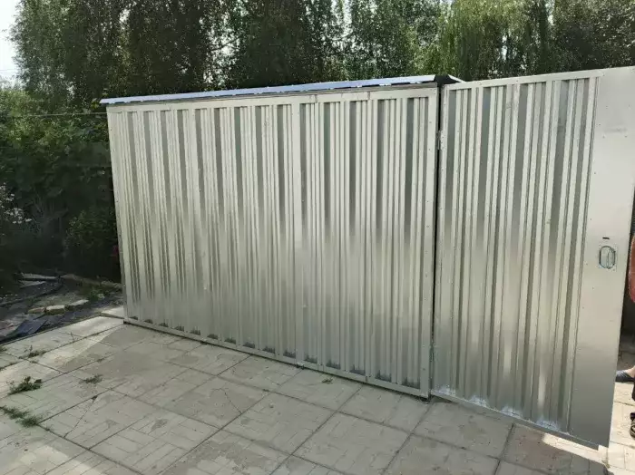 Нами была изготовлена стандартная 4-метровая конструкция с плоской крышей и торцевой воротной группой в стильной комбинации цветов светло-серого RAL 7004 для основных элементов и винно-красного RAL 3005 для фасонных элементов и крыши. Основной светло-серый цвет был выбран для того, чтобы строение гармонировало с внутренней стороной забора на участке.