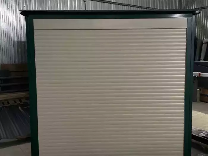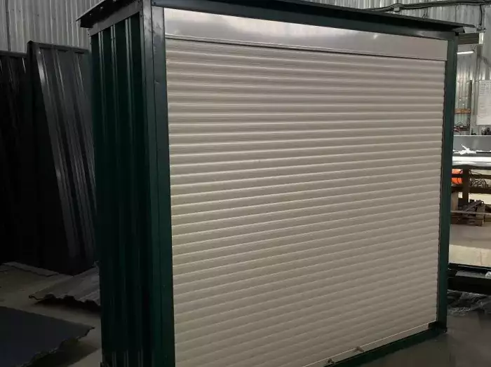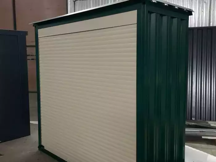 Нами была изготовлена стандартная 6-метровая конструкция с двускатной крышей и торцевой воротной группой в строгом графитовом цвете RAL 7024.