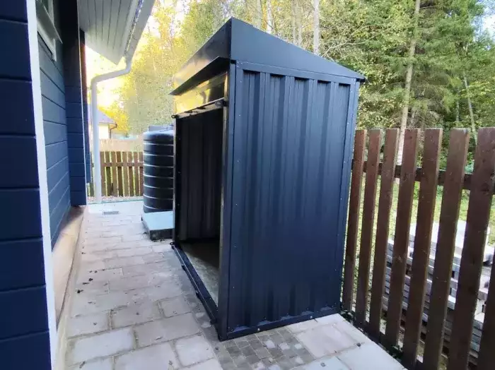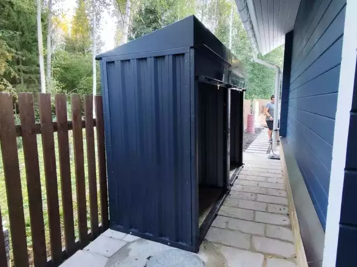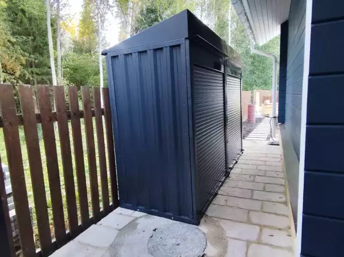 Проект: 6-метровый хозблок для хранения хозяйственных принадлежностей и инструментов в графитовом цвете.