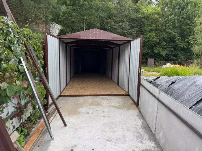 Нами была изготовлена конструкция размером 2 х 2 м с двускатной крышей. Дополнительно, по желанию хозяина участка, контейнер был оборудован стеллажом в цинковом цвете. Цветовое исполнение постройки было выбрано в сочетание цветов RAL 1014 для основных элементов и RAL 8017 для фасонных элементов и крыши (этот цвет выбирался под цвет дома на участке). Сочетание этих двух расцветок очень популярно среди наших заказчиков. Оно и неудивительно, ведь комбинация этих цветов очень выгодно смотрится на участке.