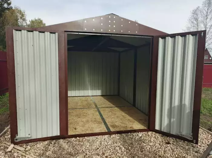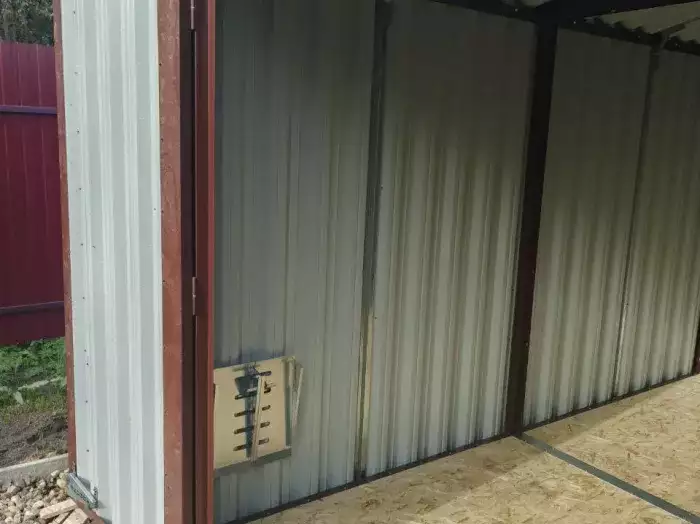 Нами была изготовлена конструкция размером 2 х 2 м с плоской крышей и торцевой воротной группой в блестящем цинковом цвете.