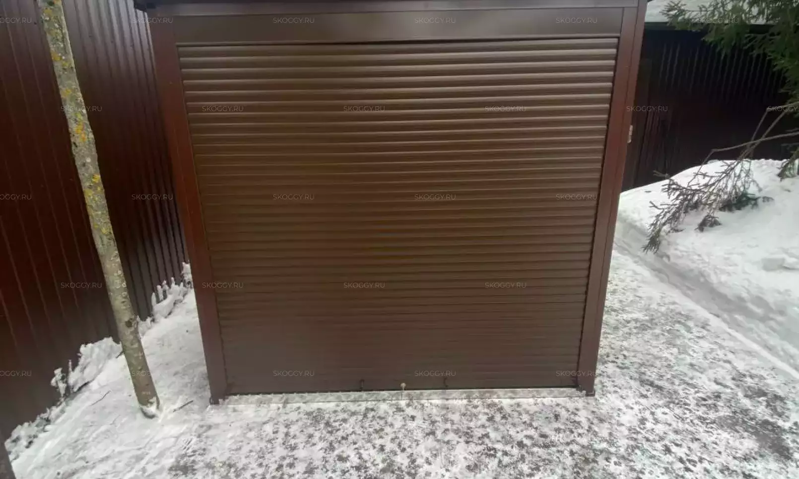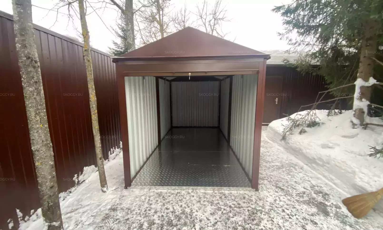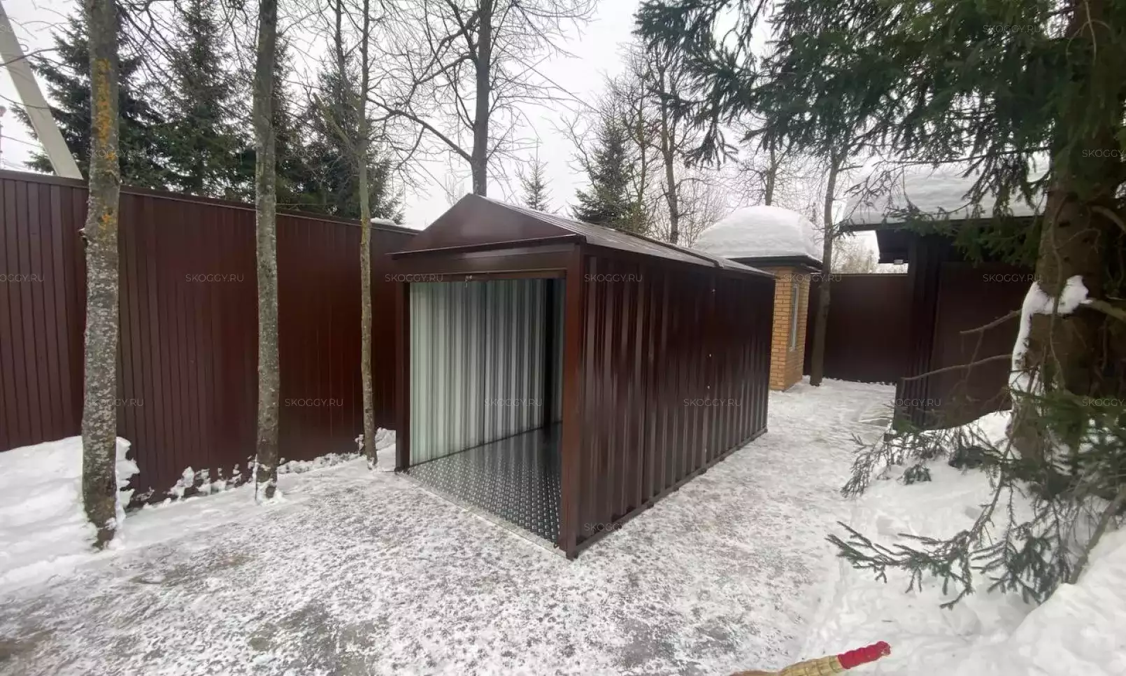 Нами была изготовлена стандартная 2-метровая конструкция с односкатной крышей и торцевой воротной группой в комбинации цветов RAL 1014 «слоновая кость» для основных элементов и шоколадно-коричневого RAL 8017 для фасонных элементов и крыши.