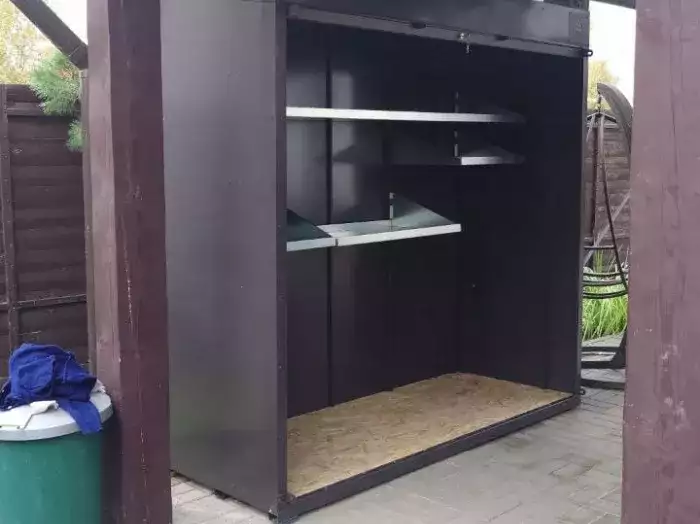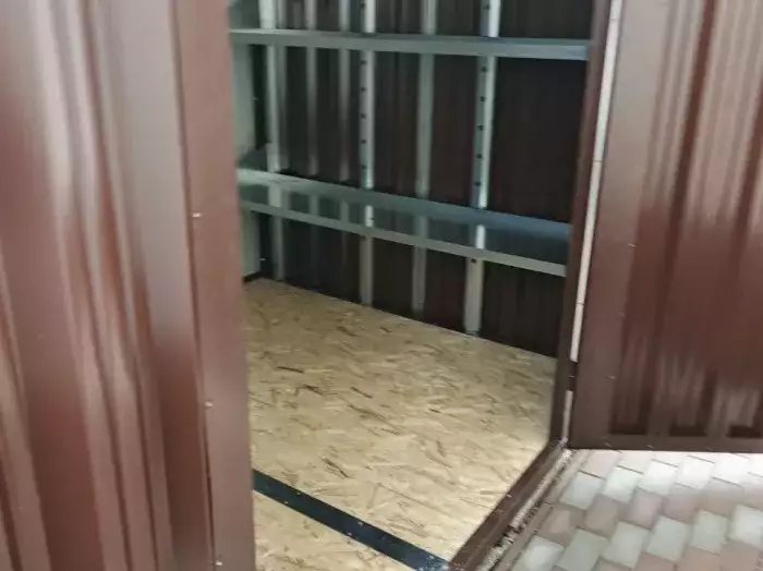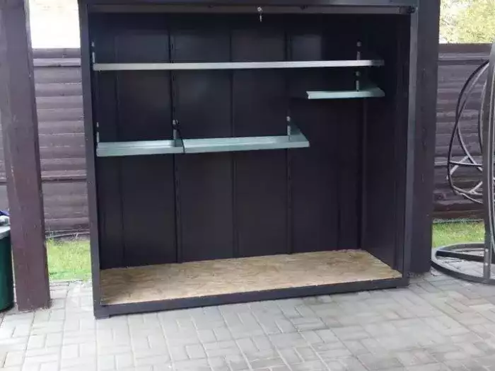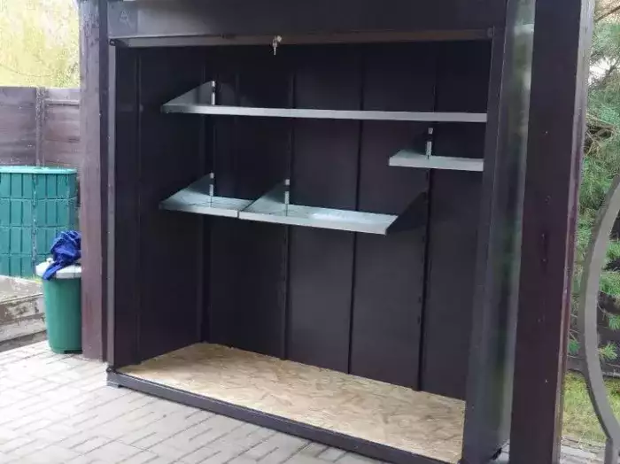 Дополнительно хозблок оборудован прямым стеллажом с тремя полками в стандартном цинковом цвете.