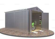 Если же вы решили сделать забор из профнастила, то придется выровнять под него землю. Но, благодаря этому, забор не только надежно защитит вашу территорию и будет долго служить, но и хорошо будет сочетаться с садовым хозблоком. Если вы сделаете выбор в пользу легковозводимых контейнеров СКОГГИ, то можно будет подобрать его окрас под тон ограждения в палитре RAL. Кроме того, вы сможете заказать принт под лес, траву, листву или камень и спрятать металлический хозблок среди деревьев или сделать его гармонично сочетающимся с цветом кладки вашего дома.