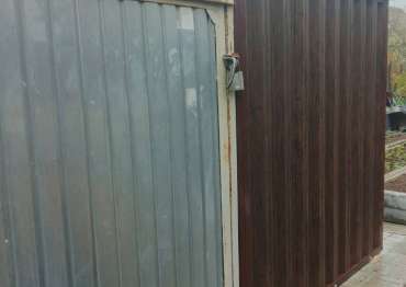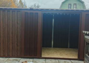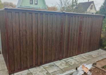 Нами была изготовлена конструкция размером 5 х 1,97 м с плоской крышей и боковой воротной группой в комбинации расцветок «под дерево» Темный дуб для основных элементов и шоколадно-коричневого RAL 8017 для фасонных элементов и крыши.