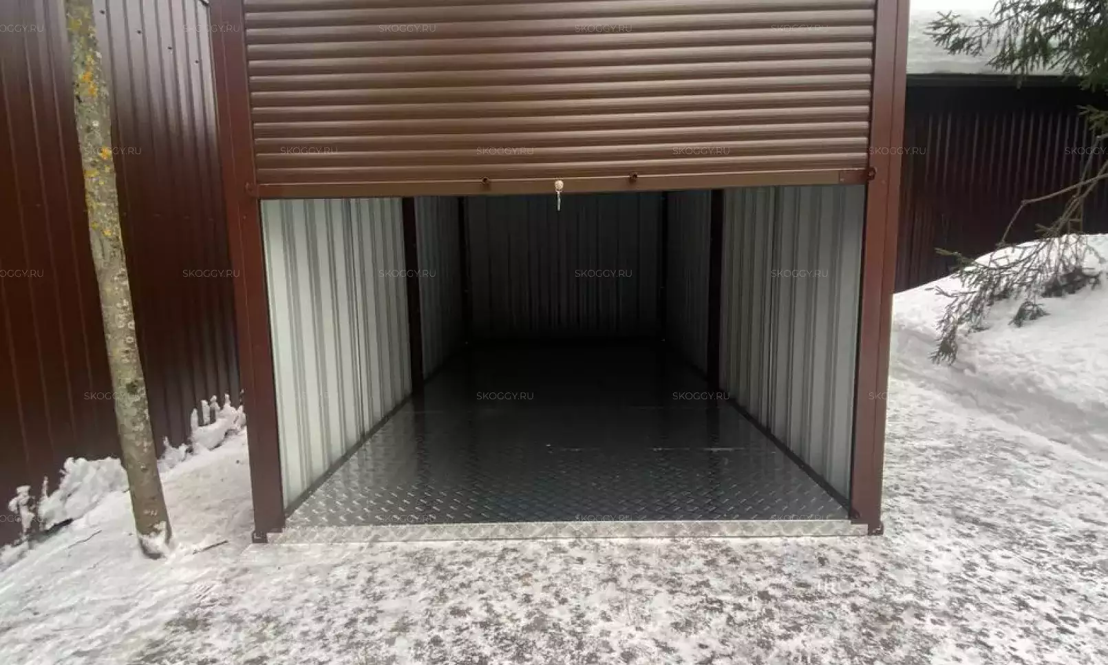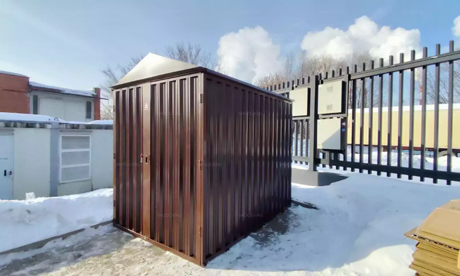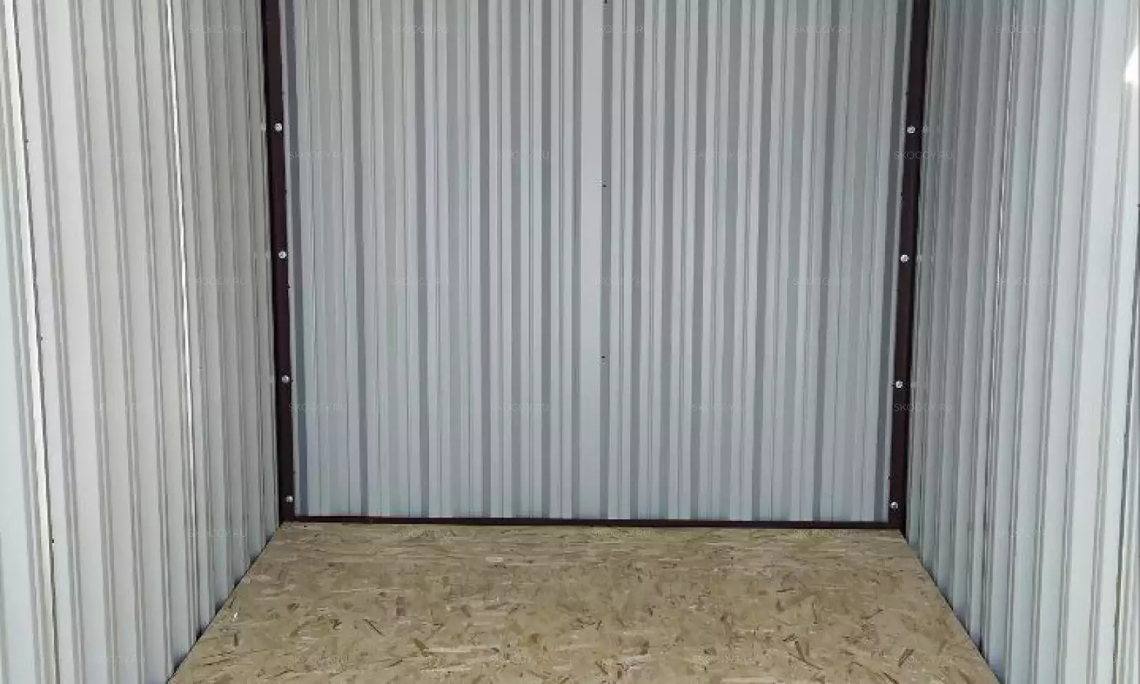Нами была изготовлена стандартная 4-метровая конструкция с плоской крышей и торцевой воротной группой в сочетании цветов RAL 8019 для основных элементов и RAL 9003 для фасонных элементов. Дополнительно контейнер оборудовали световым окном размером 65 х 35 см.