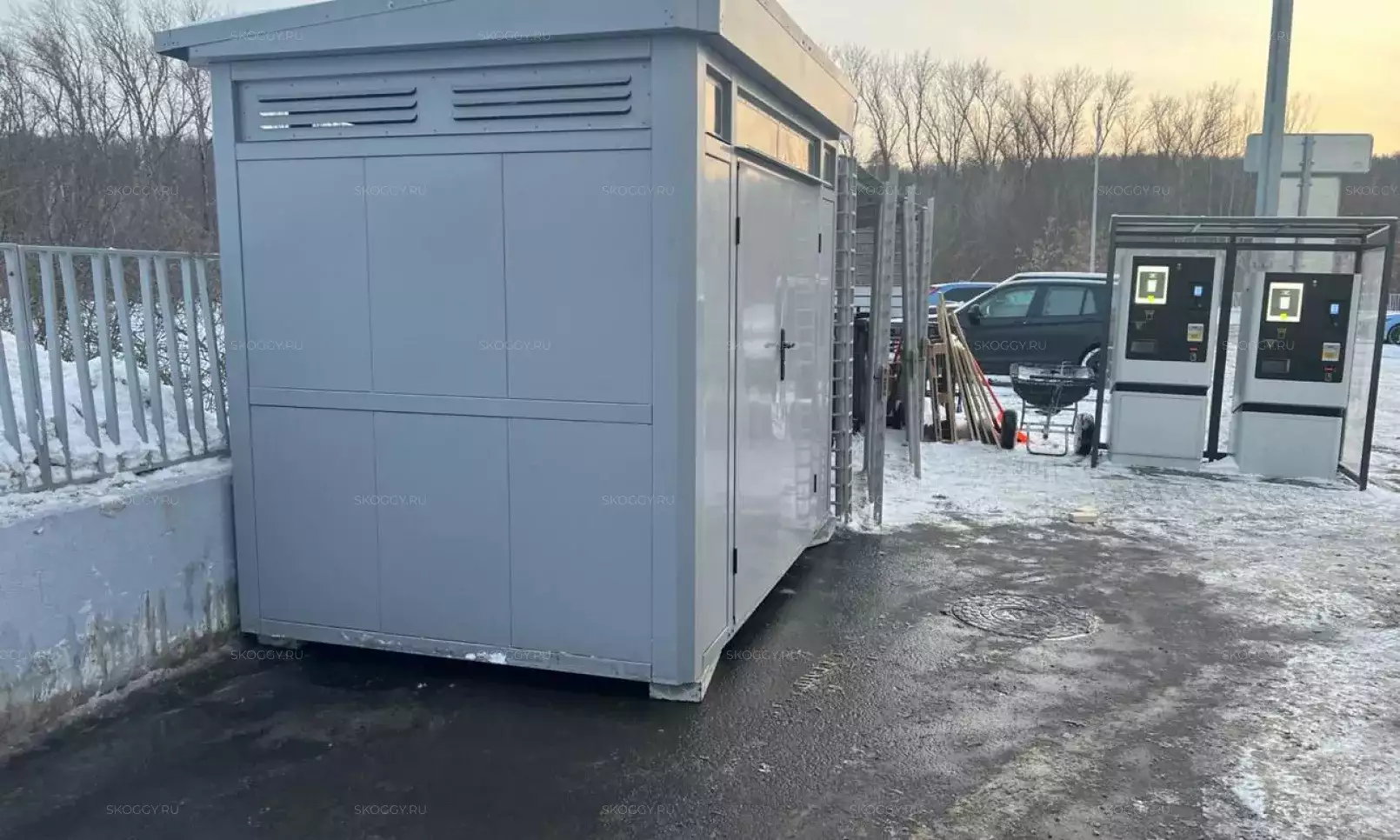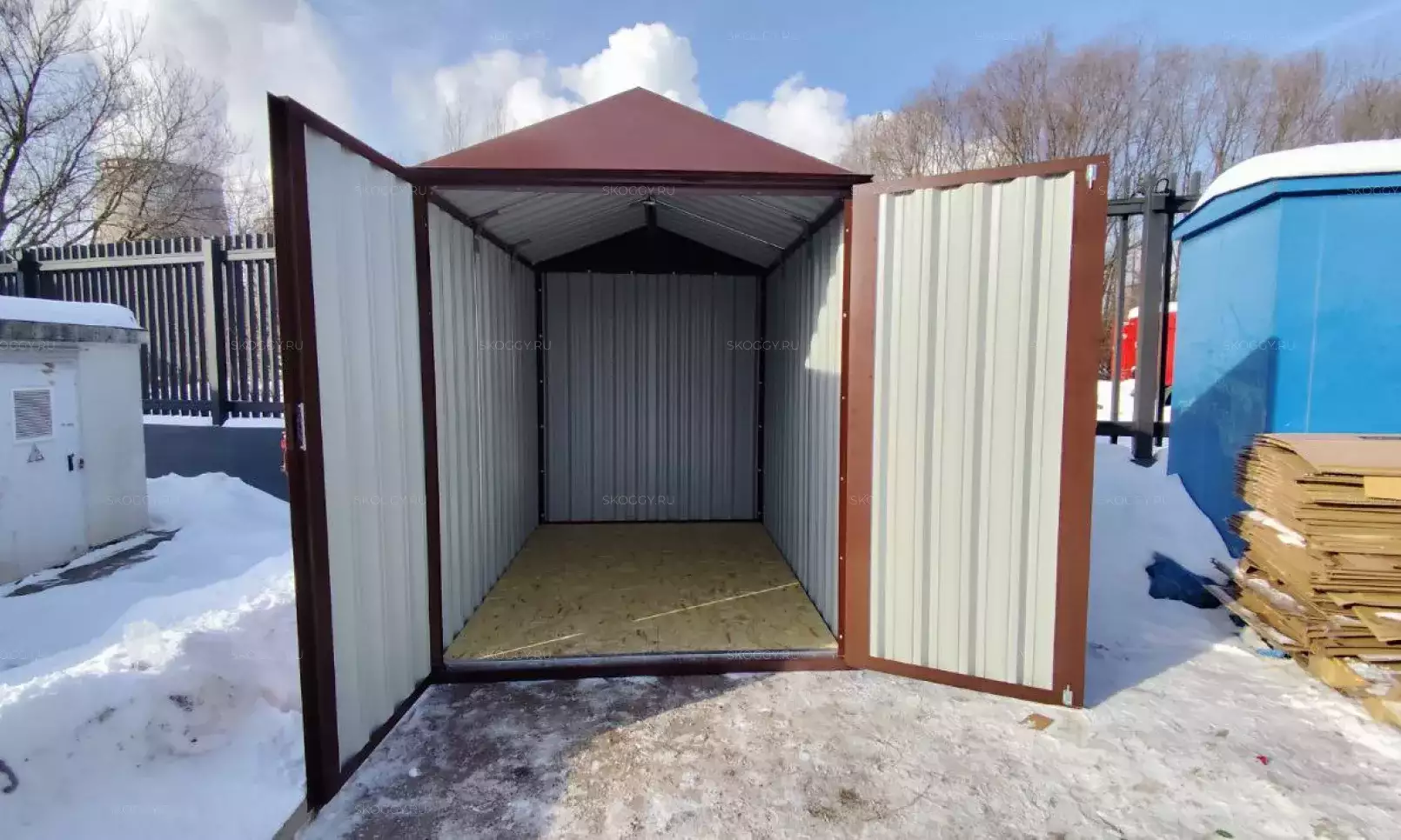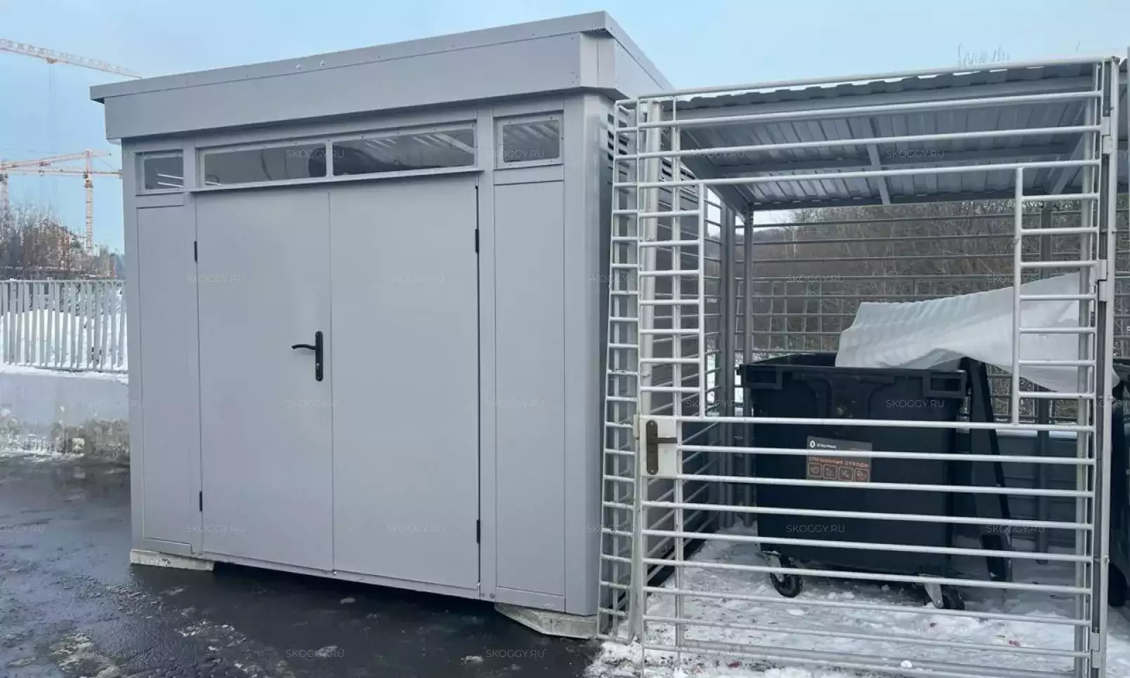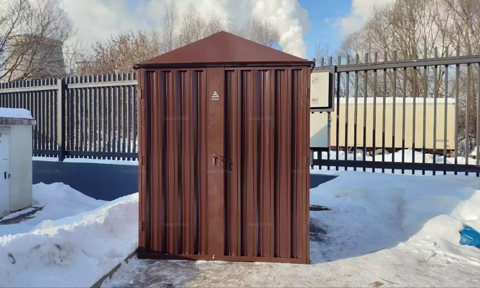 Нами была изготовлена стандартная 4-метровая конструкция с плоской крышей и торцевой воротной группой в сочетании цветов RAL 8019 для основных элементов и RAL 9003 для фасонных элементов. Дополнительно контейнер оборудовали световым окном размером 65 х 35 см.